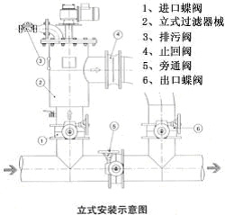 全自動(dòng)過濾順路應(yīng)水平或垂直安裝,同時(shí)應(yīng)注意進(jìn)水方向與外殼箭頭方向應(yīng)一致。(見安裝示意圖)