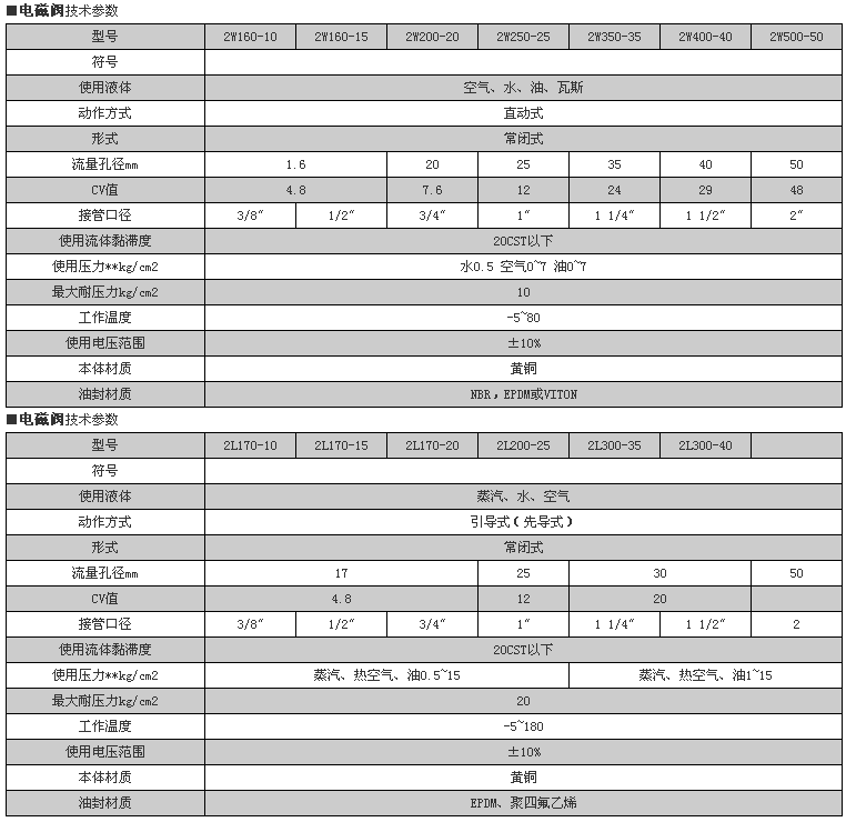 2W系列電磁閥,閥體采用鍛壓成型,內件不銹鋼制作,用于管路中對液體,氣體介質通斷的自動控制。兩口兩位直動式電磁閥,斷電打開,通電關閉閥體材質為銅,最大耐壓使作壓力:17kgf/cm2環(huán)境溫度:0℃~65℃產(chǎn)品系列化生產(chǎn),體積小,流量大,適用范圍廣按閥上所表流向箭頭,可任意安裝;為增強使用壽命,最好線圈向上,水平安裝。